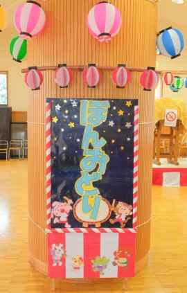 例年、園庭で行っていた盆踊り大会ですが、今年度は熱中症対策のため、3Fホールを会場にして行いました。夕方に保護者の方に集まっていただき、甚平や浴衣姿になった子どもたちは、お買い物券の入ったバックを持って盆踊り会場へ…