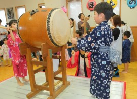 年長さんの力強い太鼓に合わせ、太鼓の周りで輪になって、盆踊りを踊りました。かわいい甚平や浴衣姿で夏祭りの雰囲気を楽しむことができました。 |